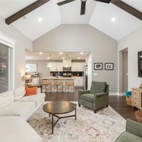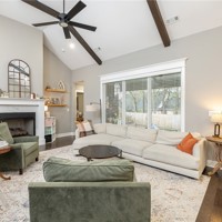 A well-designed single-level home offering 4 bedrooms and 2 baths with a bright, open-concept layout that creates an easy flow between the living area and kitchen, all within 1,792 square feet of thoughtfully arranged space. The kitchen features a large island, stainless steel appliances including a gas range, and a separate dining area overlooking the backyard. The living area feels warm and inviting with vaulted ceilings, wood floors, and a cozy gas log fireplace. Step outside to a covered patio and enjoy the privacy of a fully fenced backyard—perfect for relaxing or entertaining.